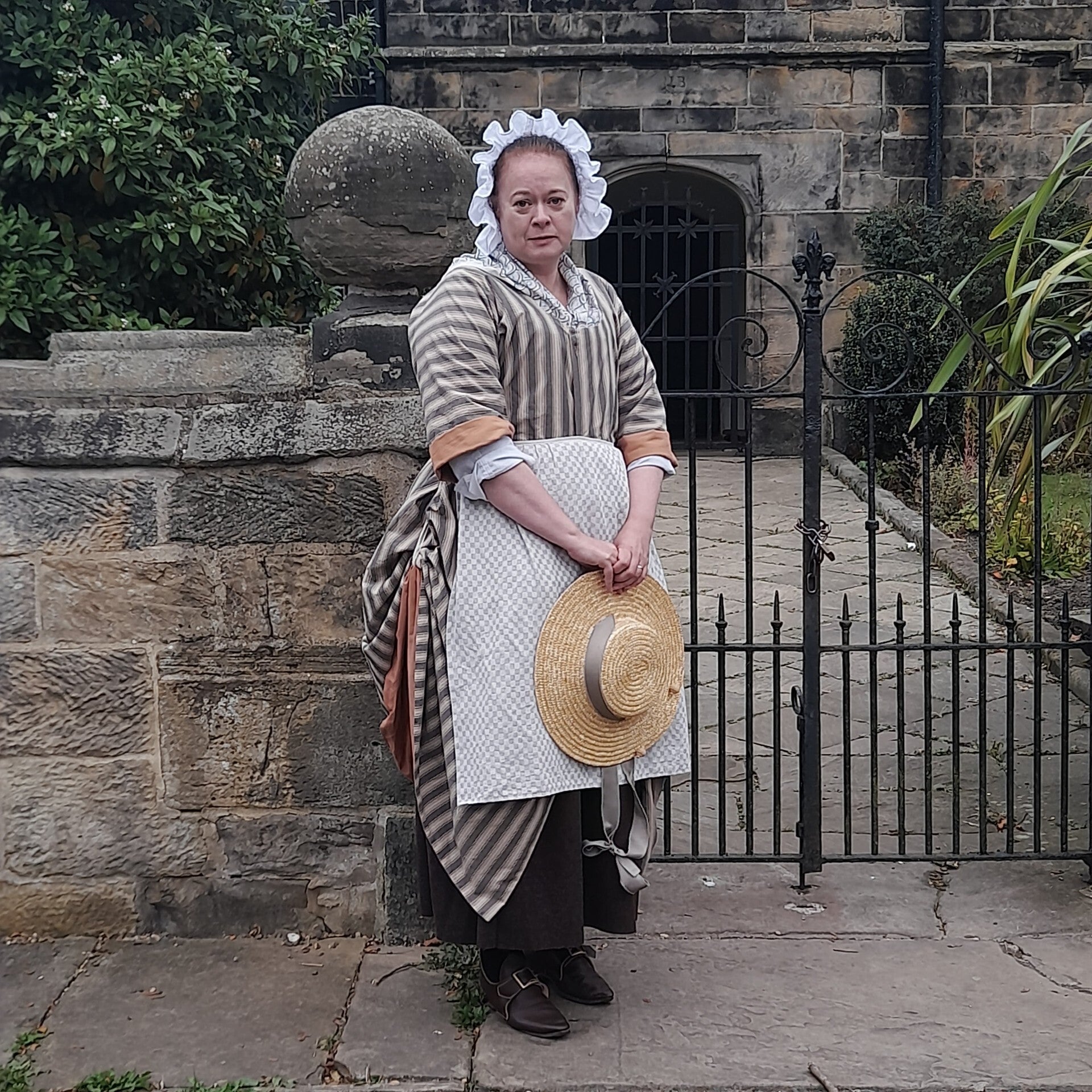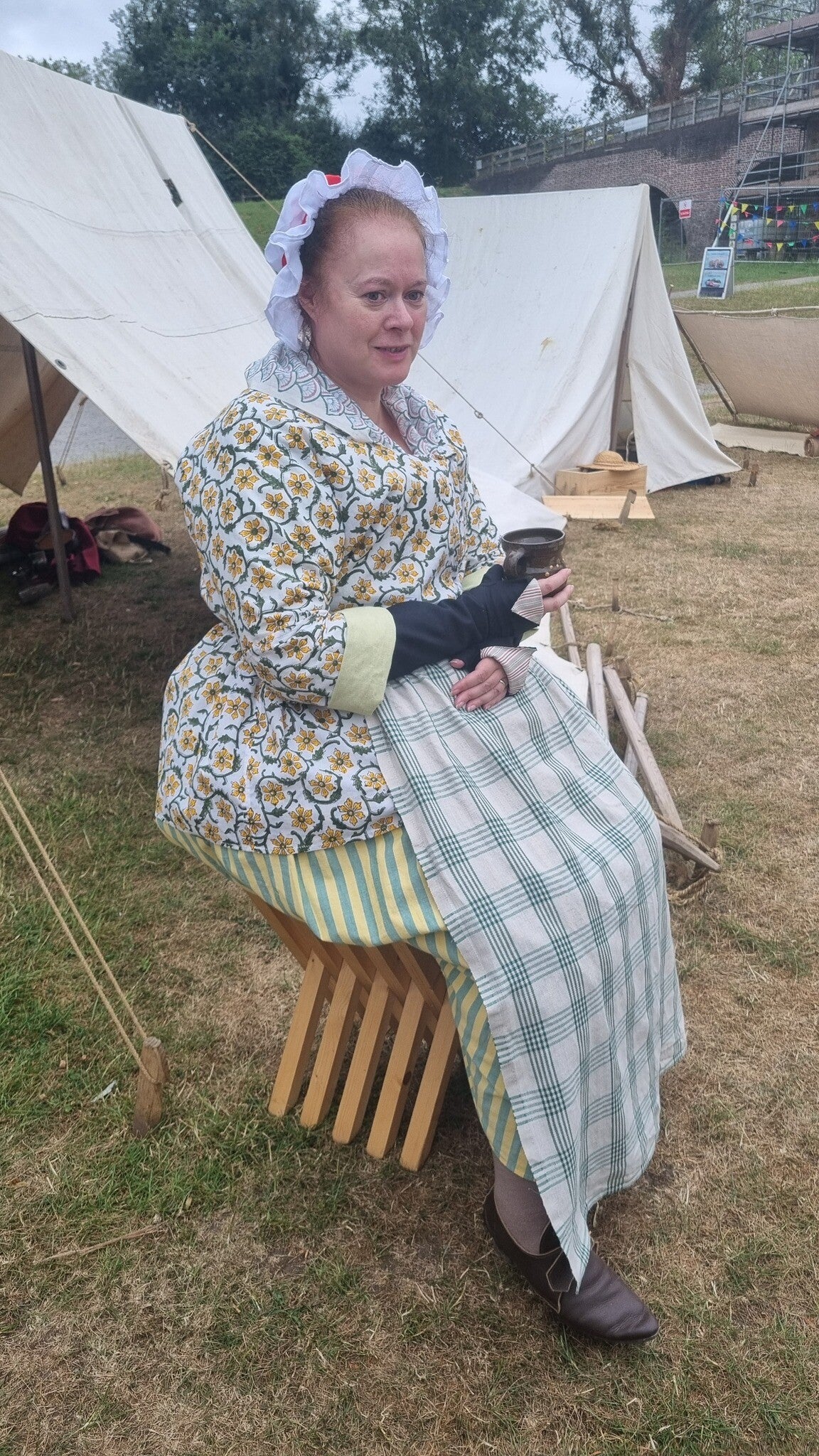 When we returned up North after living down in Somerset for a few years, and once Covid was out the way, we looked forward to re-enacting again. One of our friends who we’d met through our time in the Sealed Knot Society (English Civil War re-enactment) had joined the 6th, and Pete was desperate to give it ago. I wasn’t so sure, as I’m just not that interested in the clothes from that era (shallow, I know). But the thought of getting to wear stripes and bright printed cottons tempted me to get involved.