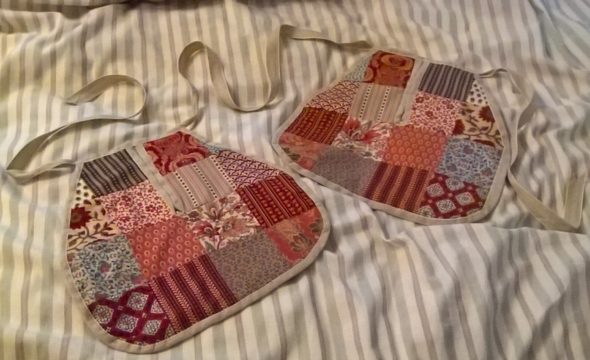 Separate pockets were essential for every woman during the 18th Century – and possibly before and after. These were tied around the waist securely underneath the outer skirt/petticoat. Pockets could be either single or in pairs. As I’m known to enjoy some patchworking on occasion, I had plenty of small pieces of suitable cotton fabric to make a patchwork pair of pockets. My favourite quilting fabric designer is French General, who’s inspired by anything vintage French, including wallpapers and textiles from old chateaux, and I had several fabrics in my stash which would pass as 18th Century. My pockets are probably my favourite thing I’ve made. Although no one else sees them, they bring me joy when I wear them – they are so colourful and cheerful. And so practical – I can fit two mobile phones, tissues, lip balm, house and car keys, husband’s wallet and other essential ladies’ bits into them and carry around all day resting on my hips. How did I ever manage without them.
