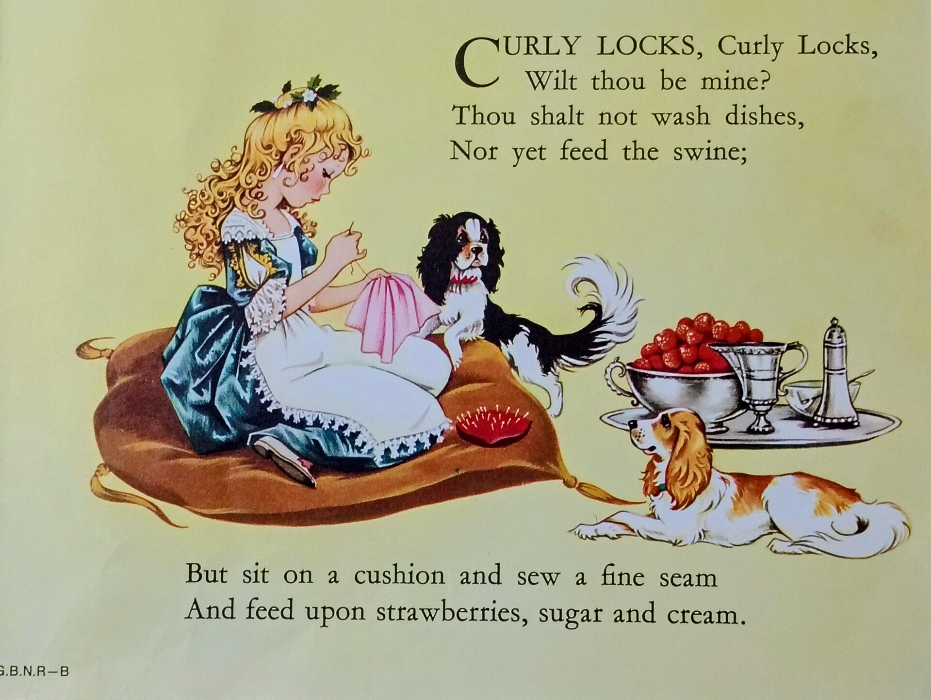 There’s only one rhyme which has a 17th Century illustration – ‘Curly Locks, Curly Locks, wilt thou be mine?’ – but there are two fairy tales which are given a definite 17th Century vibe.